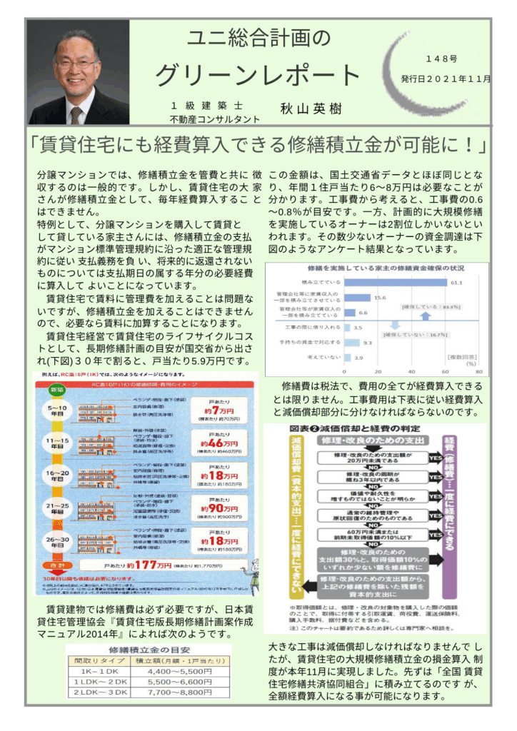 Notice: Function _load_textdomain_just_in_time was called incorrectly. Translation loading for the all-in-one-seo-pack domain was triggered too early. This is usually an indicator for some code in the plugin or theme running too early. Translations should be loaded at the init action or later. Please see Debugging in WordPress for more information. (This message was added in version 6.7.0.) in /home/xsuni21/second-op21.com/public_html/wp-includes/functions.php on line 6121 賃貸住宅も経費算入できる修繕積立金が可能に | 秋山英樹の不動産・建築のセカンドオピニオン