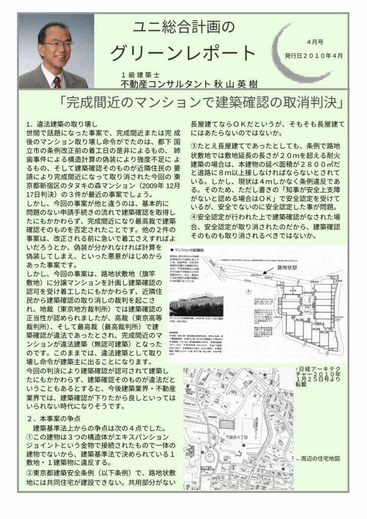 TOP  >  グリーンレポート  >  完成間近のマンションで建築確認の取消判定